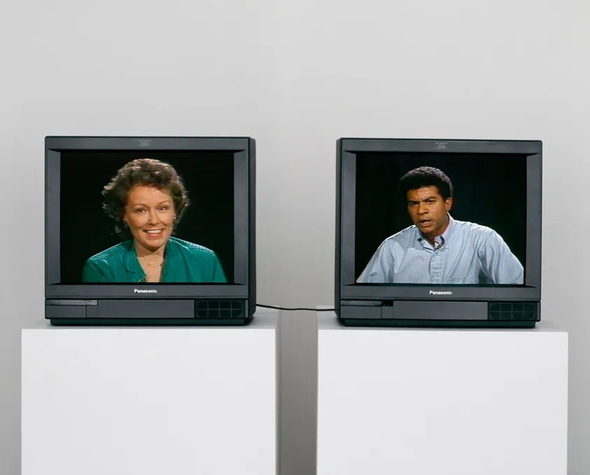 [T]he installation employs two actors, Joan Lancaster and Tucker Smallwood, who are presented in close-up, like newscasters, on two separate monitors.